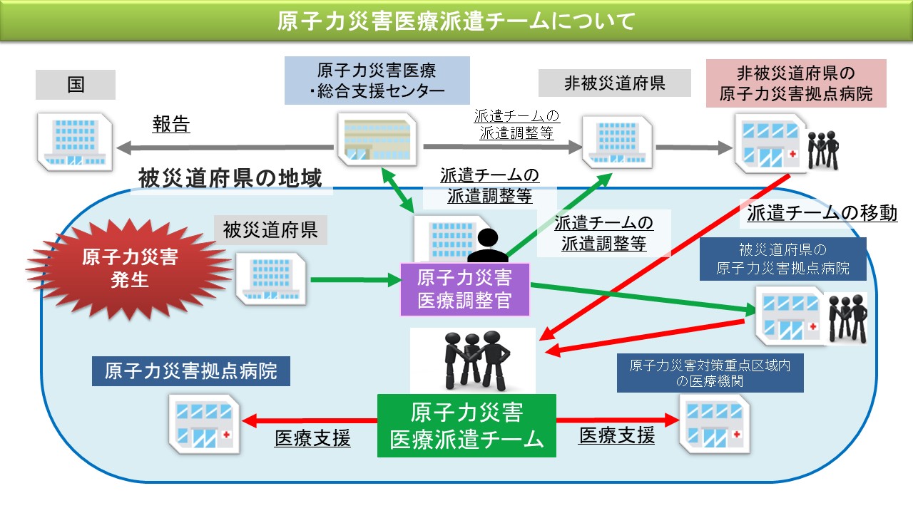 原子力災害医療派遣チームとは、原子力災害医療・総合支援センター、原子力災害拠点病院または原子力災害医療協力機関に所属し、原子力災害が発生またはそのおそれがある被災道府県において救急医療等を行うことのできる専門的な研修、訓練を受けた医療チームです。