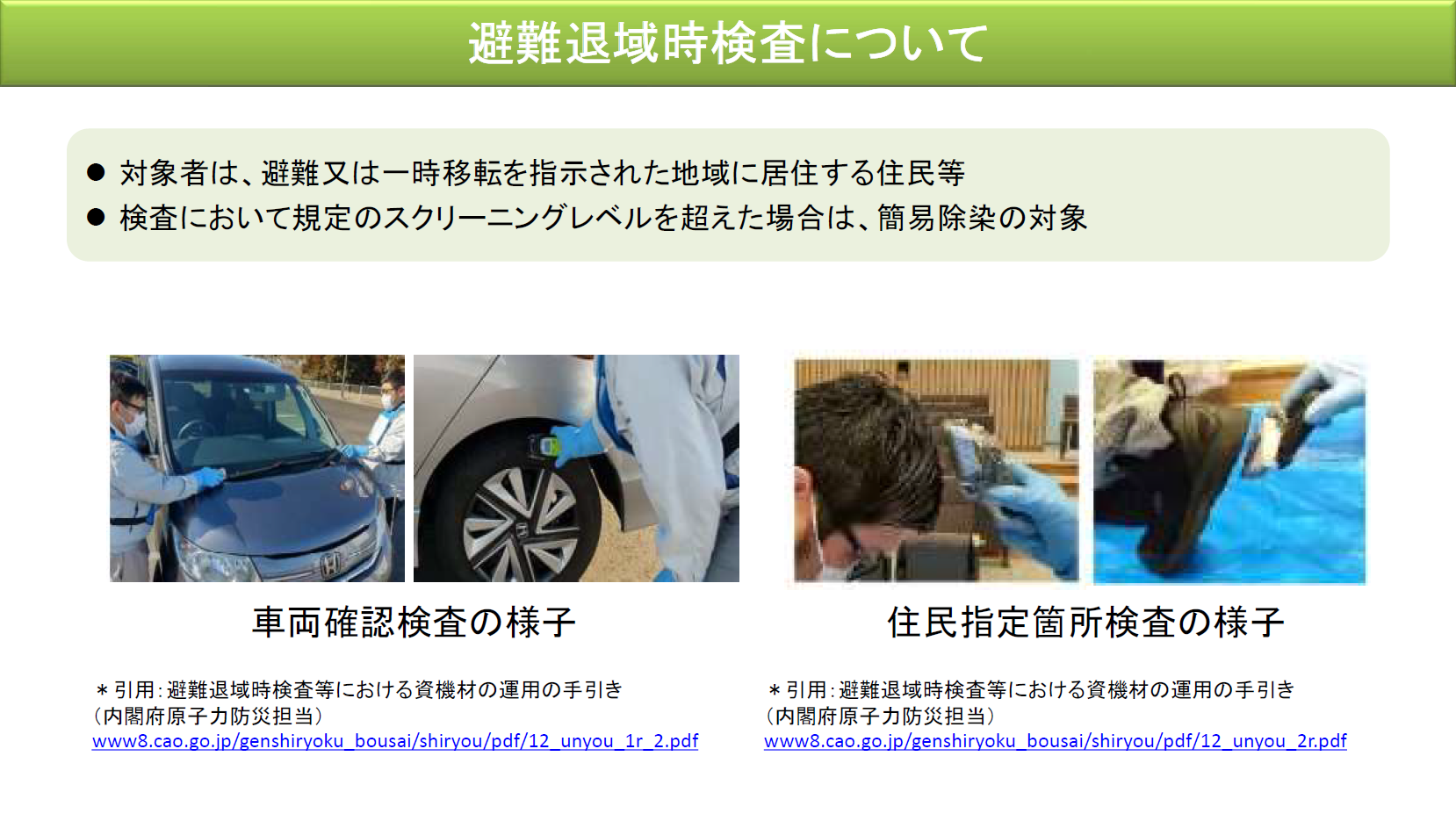立地道府県等は、原子力災害対策指針に基づく防護措置として避難又は一時移転を指示された住民等に対して、放射性物質による表面汚染の程度を把握し、除染を実施すべき基準以下であるか否かを確認する検査(避難退域時検査)を実施し、除染すべき基準を超える場合には簡易除染等を実施しなければならないとされています。